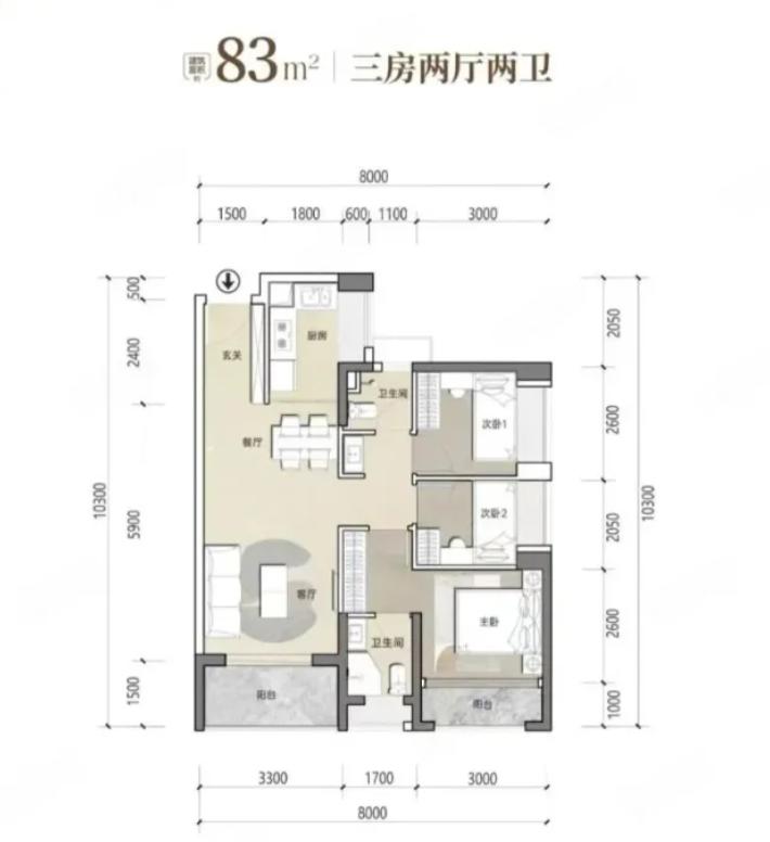 3室2厅2厨1卫 建面83m²