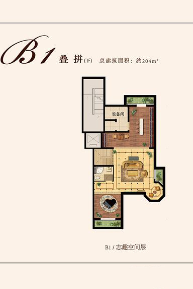 B1户型(地下一层),户型居室:【4室4厅1厨1卫】,建筑面积:【204平方米】