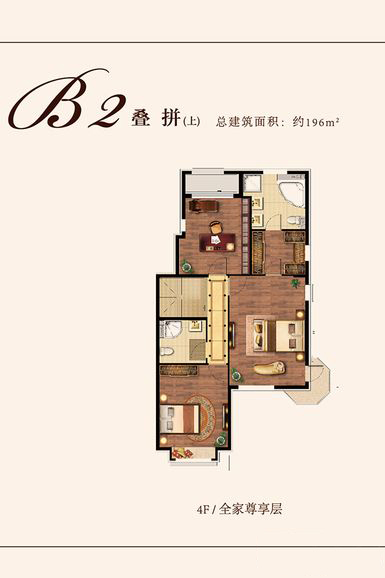 B2户型(四层),户型居室:【4室3厅1厨3卫】,建筑面积:【196平方米】