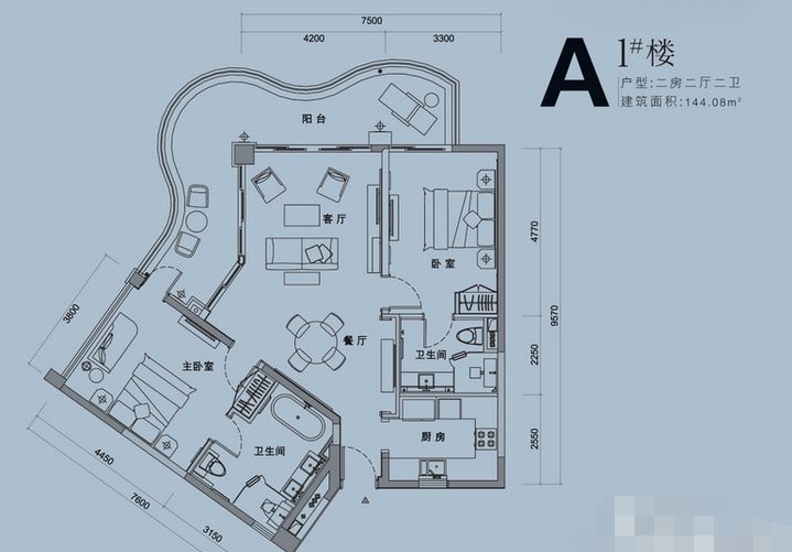 A,户型居室:【2室2厅2厨1卫】,建筑面积:【144平方米】