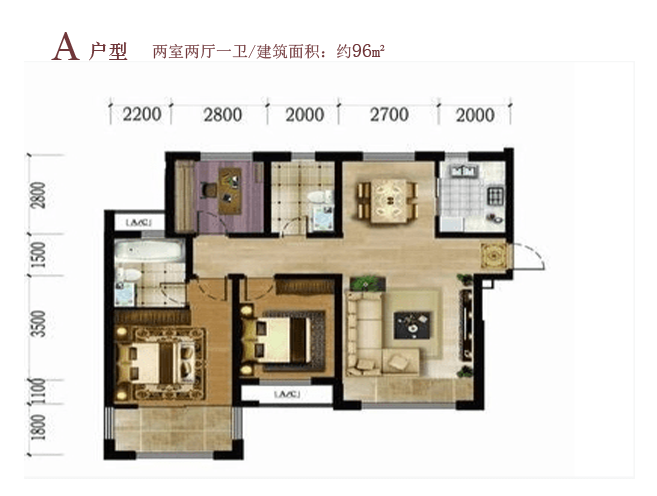 2室2厅1厨1卫 建面96m²