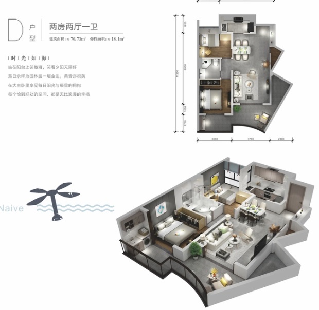 D,户型居室:【2室2厅1厨1卫】,建筑面积:【76平方米】