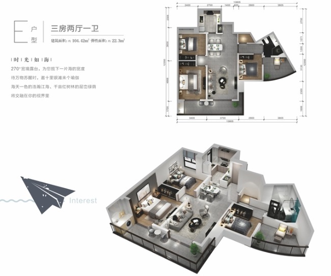 E,户型居室:【3室2厅1厨1卫】,建筑面积:【104平方米】
