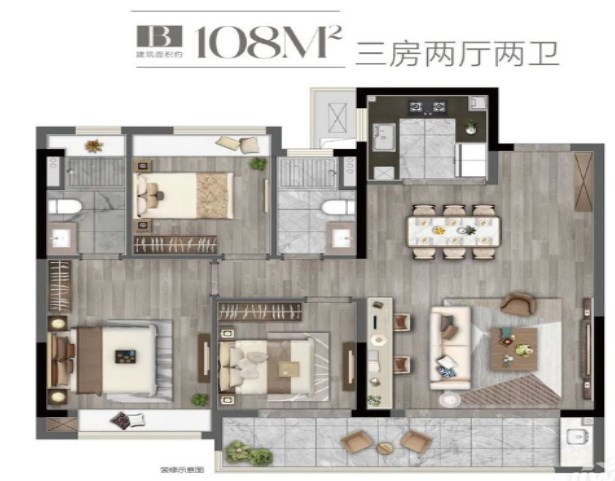 108,户型居室:【3室2厅1厨2卫】,建筑面积:【108平方米】