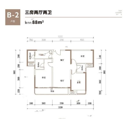 B2,户型居室:【3室2厅1厨2卫】,建筑面积:【88平方米】