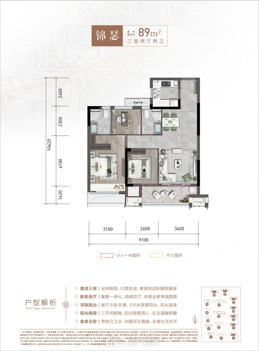 89,户型居室:【3室2厅1厨2卫】,建筑面积:【89平方米】