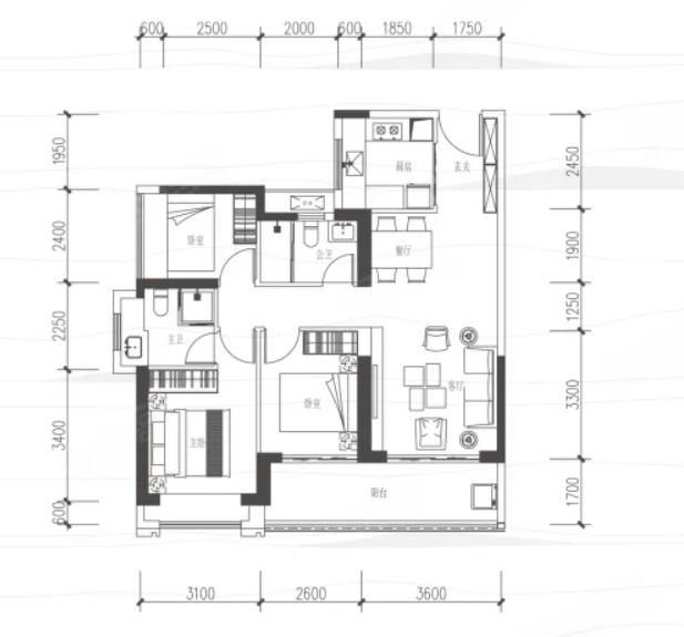 1,户型居室:【3室2厅1厨2卫】,建筑面积:【100平方米】