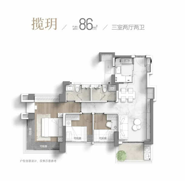 86,户型居室:【3室2厅1厨2卫】,建筑面积:【86平方米】