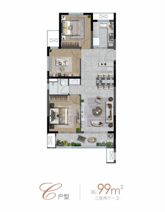 3室2厅1厨1卫 建面99m²