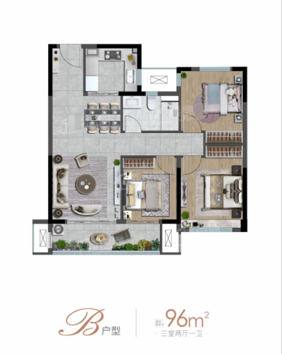 3室2厅1厨1卫 建面96m²